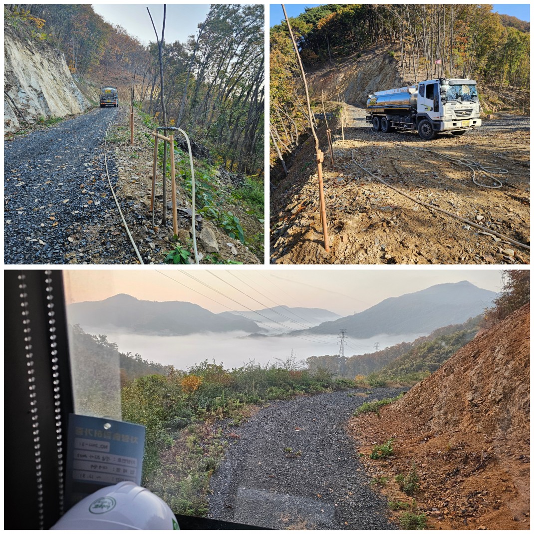 아카시아나무 관수하러 정말 높이도 산으로 올라갔습니다.발아래깔린 안개를 보세요.중간쯤 올라가다 경치가좋아 찍었어요. 양봉업자들의 성화로. 아카시아를 심는다지만 나중에 저나무가자라 가지가뻣으면 저 임도의 역활이 제대로 될지...암튼 맑은공기 마시고와 기분이 좋내요^^조경관수 아카시아나무 관수